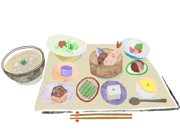 天ぷら/サラダ/豚の角煮/蕎麦豆腐/季節の小鉢/お刺身/デザート/お蕎麦*珈琲プラス料金